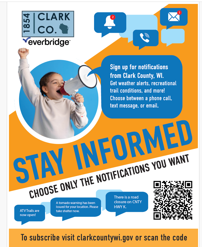 Scan the QR code or go to the Clark County site to sign up for the free alert system of Everbridge https://www.clarkcountywi.gov/post/personalized-notifications-now-available