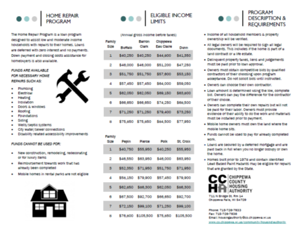 Contact Laura Rushmann 715.726.7801 at the Chippewa County Housing Authority to apply for no-interest, deferred payment loans for home repair or purchase.